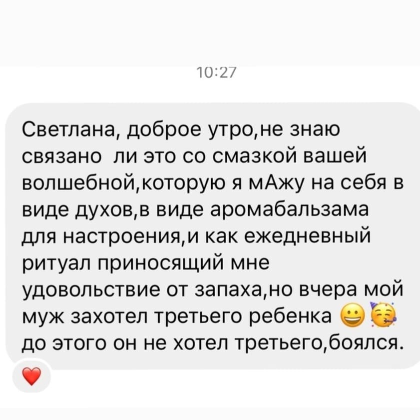 Бальзам- это афродизиак. В нём соеденены мужское (сандал) и женские (иланг, ваниль) масла. Герань регулирует гормональный фон, а масло петигрейна разгоняет кровь в области малого таза. Создаёт очень тёплую интимную атмосферу и романтическое настроение. |