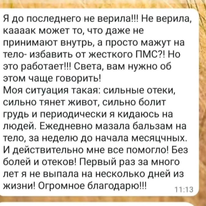Женщинам:- ПМС и климакс: Бальзам помогает снижать симптомы ПМС и климакса, облегчая эмоциональные качели и физический дискомфорт.