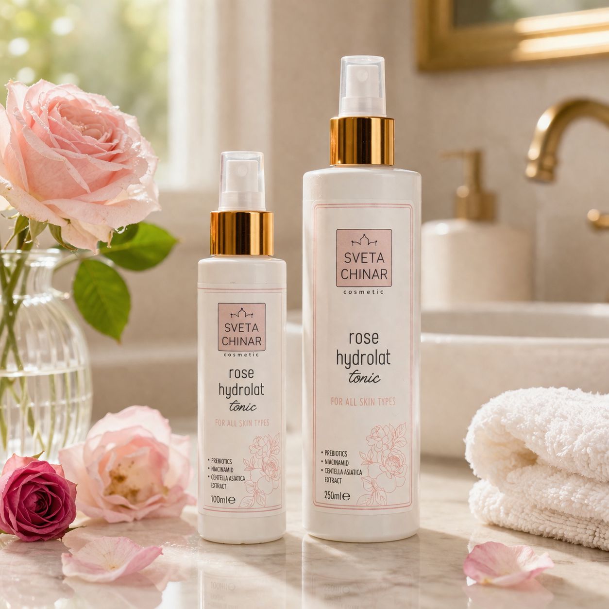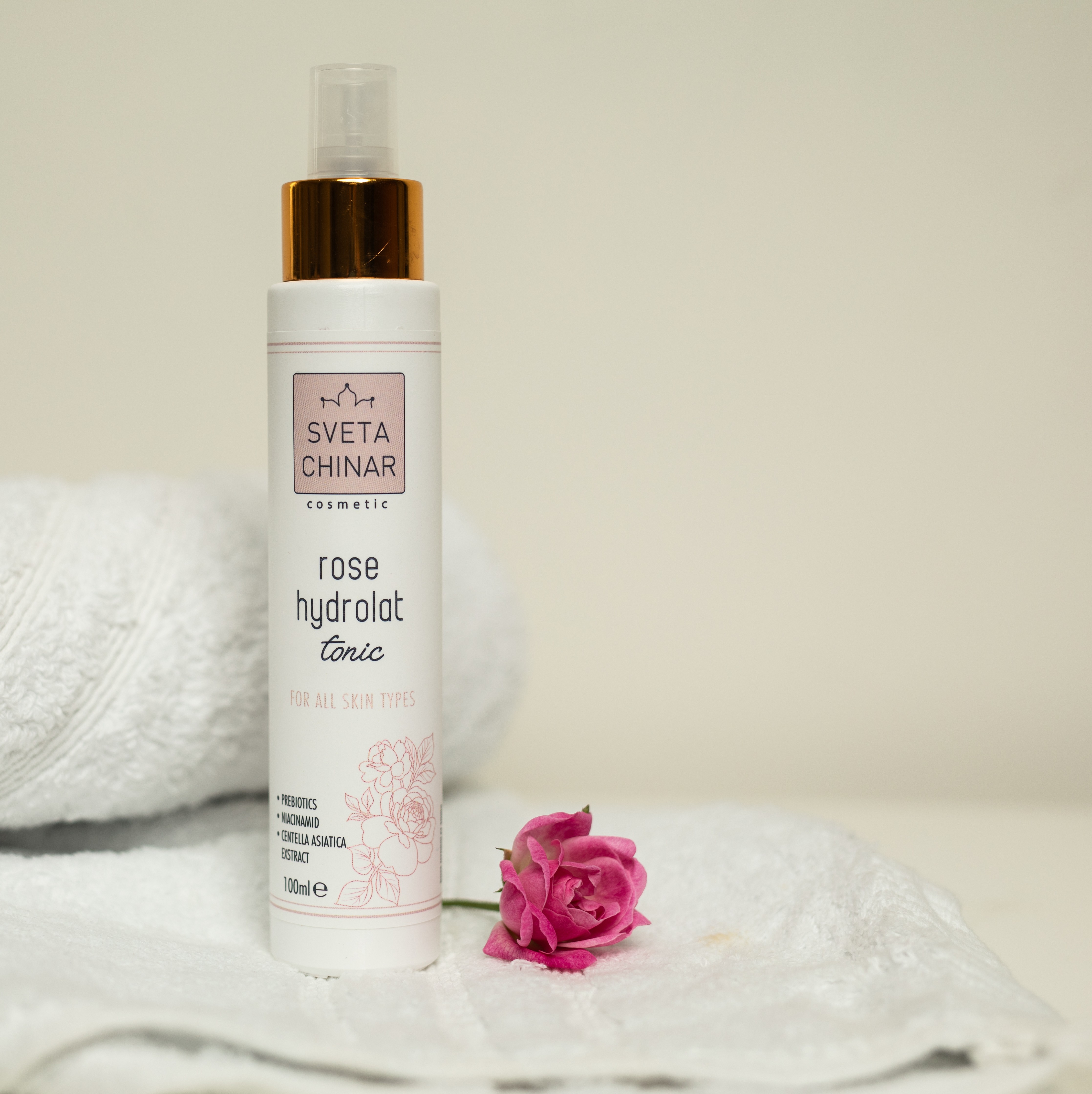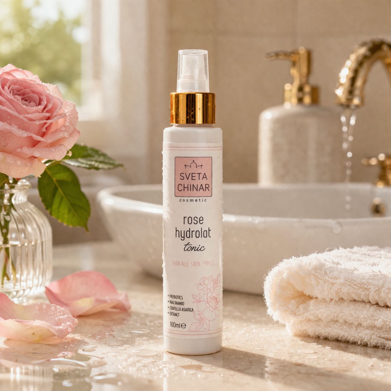 • Гидролат дамасской розы — основа тоника, увлажняет, успокаивает и восстанавливает.