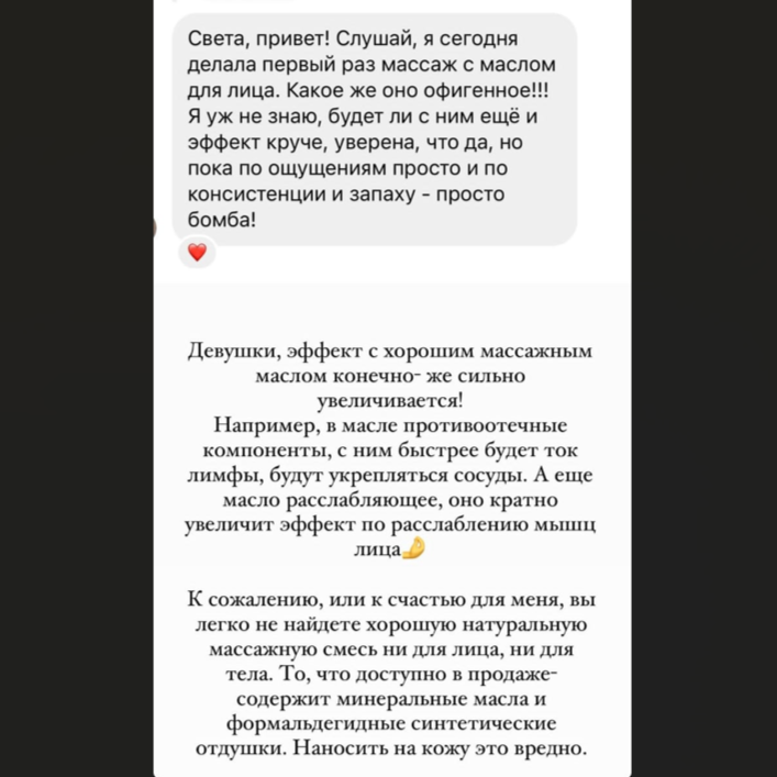 Массажное масло для лица, для самомассажей, или можно его брать с собой на сеансы массажа. Противоотечное, противовоспалительное, антивозрастное, расслабляющее, благотворно воздействует на нервную систему. Не забивает поры, не оставляет на лице пленки. |