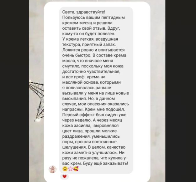 В составе крема — комплекс из 6 аминокислот, которые запускают процессы омоложения клеток, активизируют выработку коллагена и эластина, а также уменьшают воспалительные процессы в коже. Пептиды имеют накопительный эффект, и результаты становятся заметны уже через 20 дней регулярного применения (но на практике улучшения могут быть видны уже раньше!).