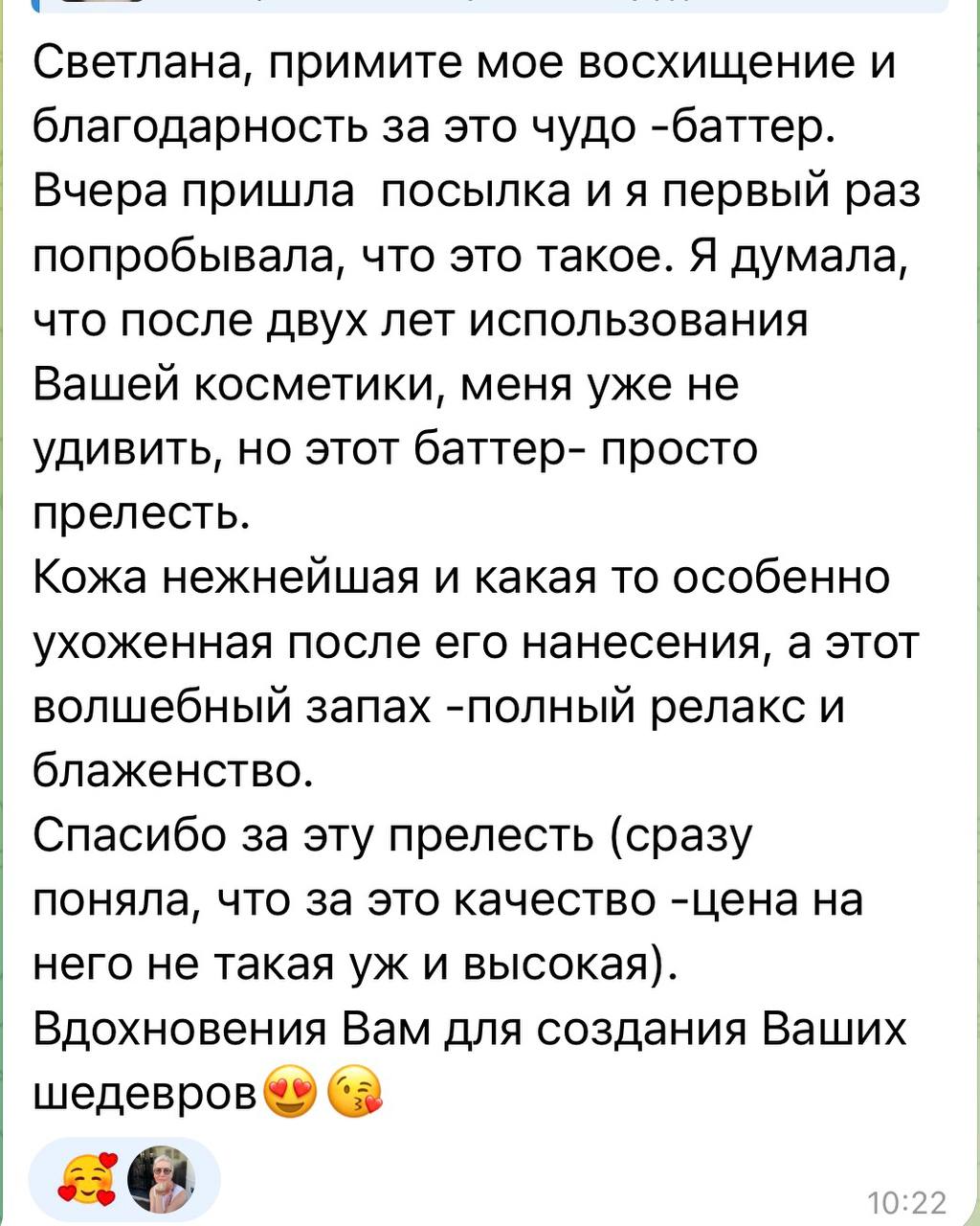 Подарите своей коже атмосферу нежности с натуральным баттером ручной работы. Созданный только из чистых, живых масел, он превращает ежедневный уход в маленький домашний ритуал расслабления и мягкого ухода.