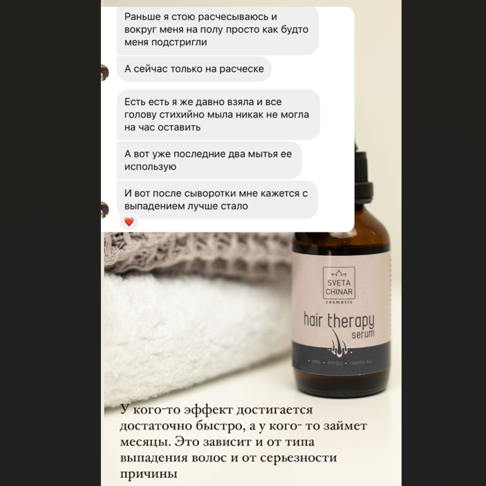 - Если волосы начинают выпадать после болезни или стресса, продолжайте использовать сыворотку. Она будет работать с окислительным стрессом и нейровоспалением, обеспечивая восстановление.